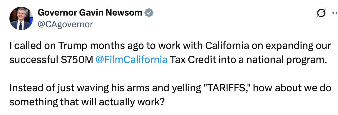 Finally, this is still on the US President’s radar (albeit sporadically) and it doesn’t seem to be going away. It’s also unlikely to go away unless either the major studios can satisfy Trump that they take his concerns seriously (i.e. some sort of demonstration that they will commit to more production in the US, with obvious consequences for countries like the UK) - or action is taken by Government to make it more attractive to shoot in the US. Governor Gavin Newsom has already increased the cap on California’s tax incentive - and is now calling on the President to introduce a federal incentive: