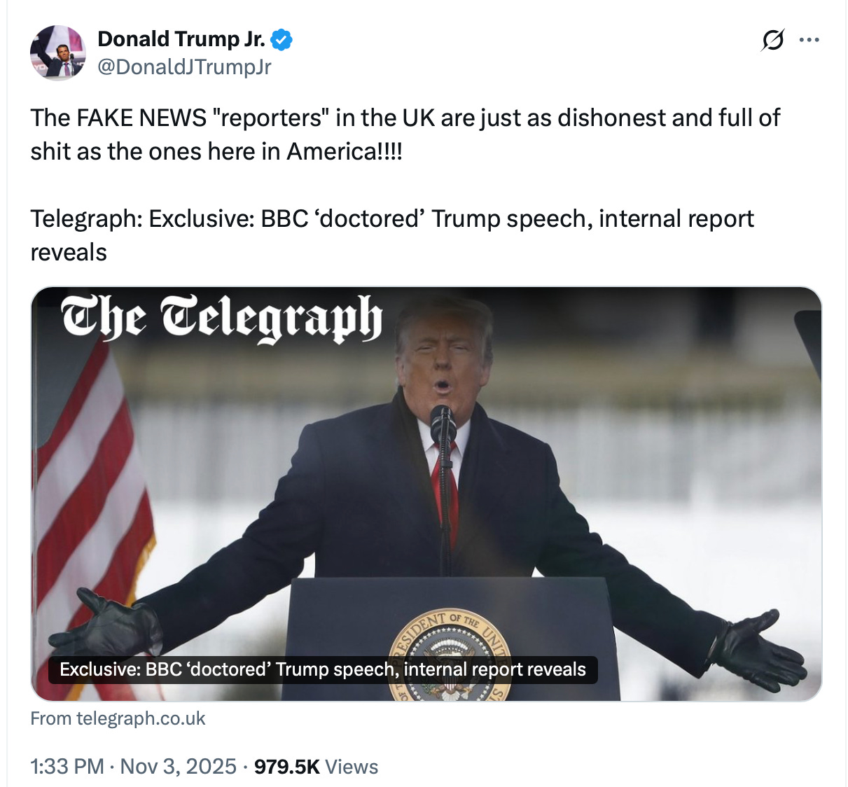 This couldn’t have have happened to a worse subject than the famously thin-skinned, mainstream media-hating President of the United States. It energises existing critics of the BBC over here - and activates new ones in the US. The President’s son has already lashed out on X: